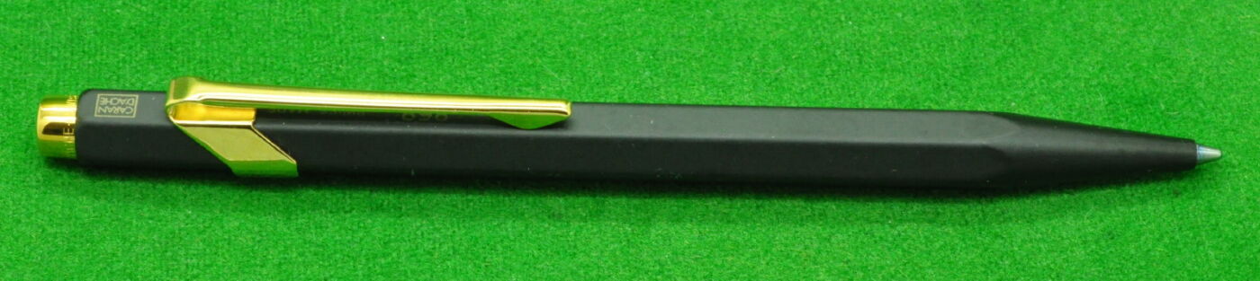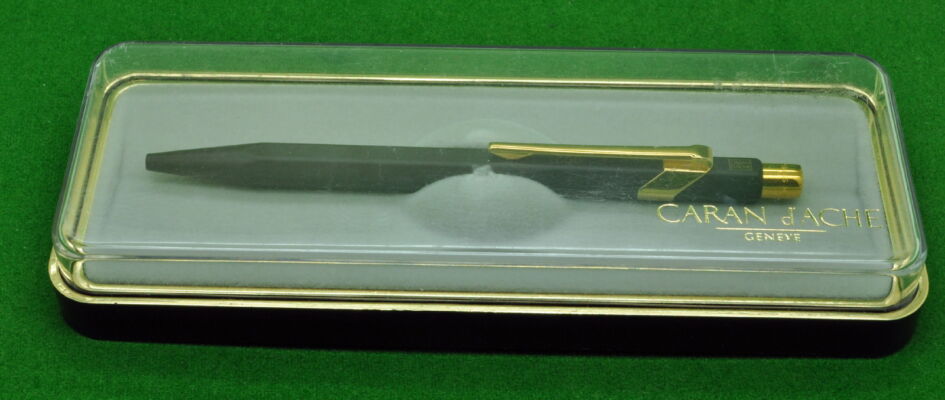 Caran D’Ache 858 Ballpoint Pen – Multifaceted Matte Black and Gold fill . In MINT Unused Condition in original Box .