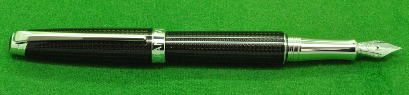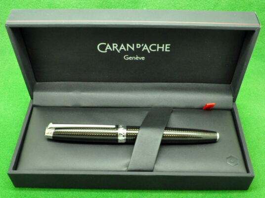 Caran d’Ache Léman de Nuit Anniversary Edition fountain pen . In Beautiful Black Laquered Guilloche with Platinum fill Trim. In Absolute Mint Unused condition in original Box with Outer Sleeve. Never Inked. Fitted with the original white 18kt golf medium tipped nib.