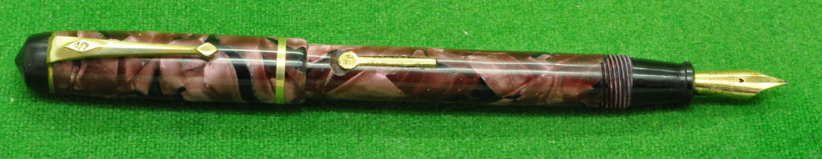 Beautiful Conway Stewart 550 Dinkie in Flame Burgundy and Black Marble with gold filled trim. In Absolute Mint condition. Fitted with the original 14kt gold semi flex broad tipped nib.