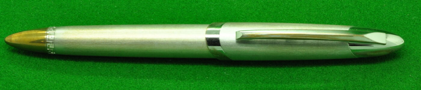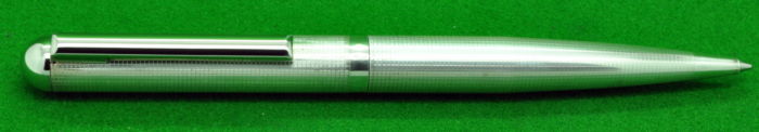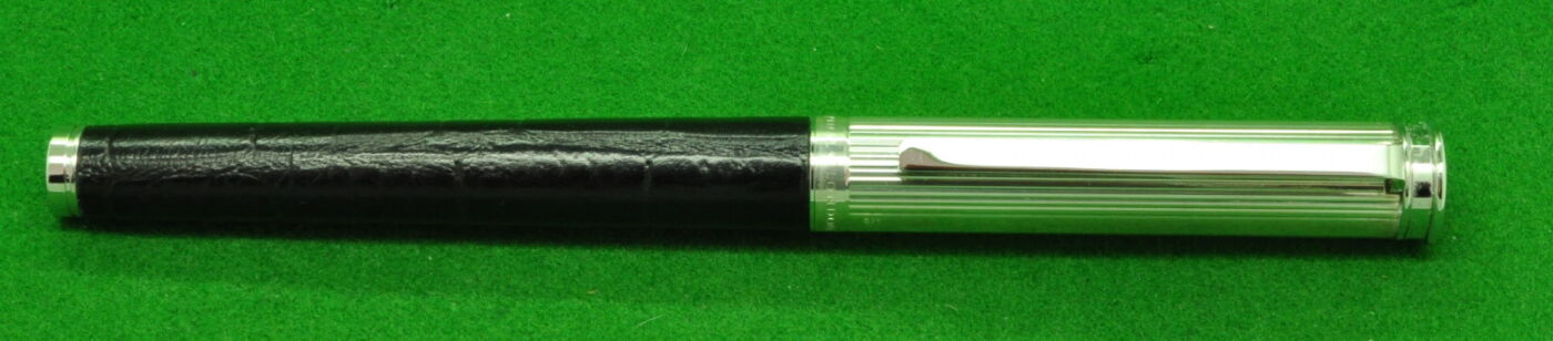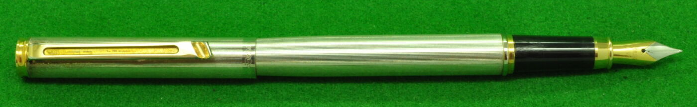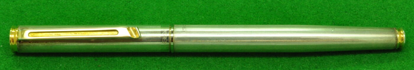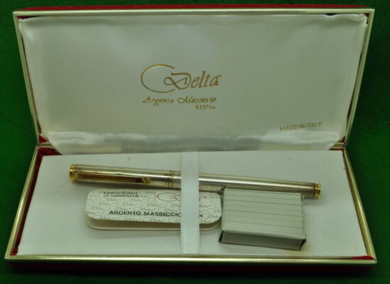 Scarce Early Delta Fountain Pen in Solid Silver with pin stripe pattern. In Perfect condition but with one small ding under the clip. Fitted with the original twin tone medium tipped Nib.