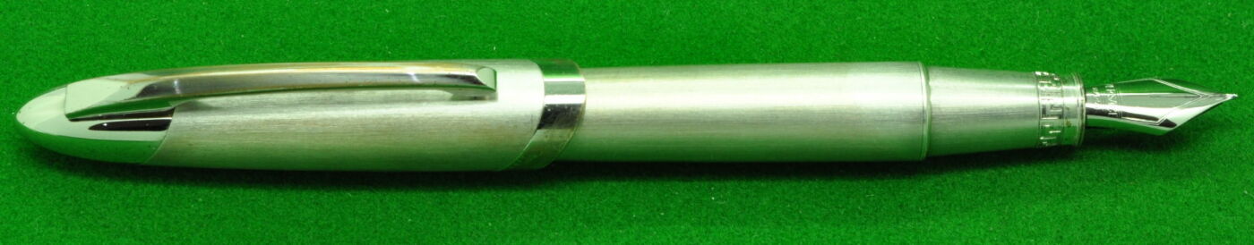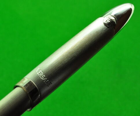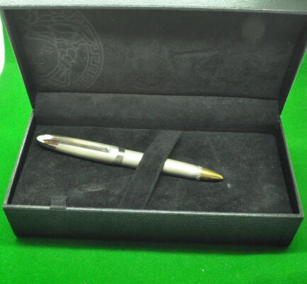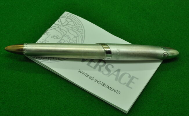 Stunning, Very rare Gianni Versace Fountain Pen in Brushed Silver. In Perfect Near Mint condition but with slight wear to clip ridge. Complete in original leather box with papers and converter. Fitted with the original white 18kt gold medium tipped nib. Exceptional high quality item.