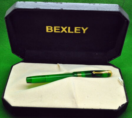 Beautiful Bexley Gemstone Emerald Fountain Pen with gold filled trim. MINT Unused condition in original Box (box with some flaking of outer surface). Fitted with the original 14kt gold medium tipped nib.