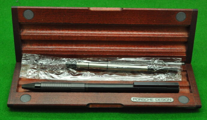 Porsche Design 41021 Ballpoint in Titanium Carbide. In Near Mint condition in original Wooden Box with outer , Papers and new refill.