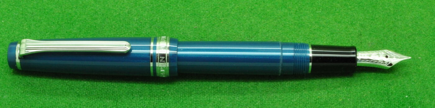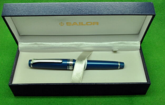 Sailor 1911 Pro Gear Fountain Pen in Ocean Blue with Chrome Trim. In Mint Unused condition in original Box. Never inked. Fitted with the original white 14kt gold Medium tipped nib.