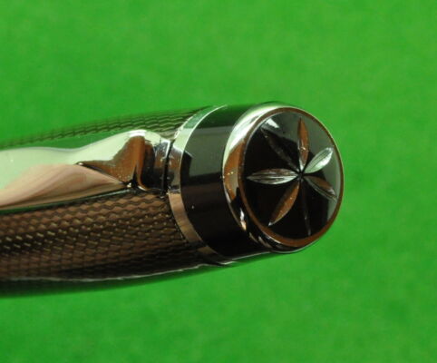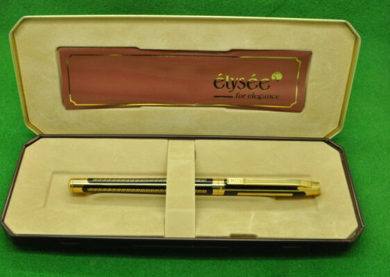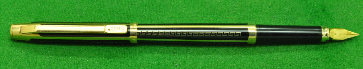Beautiful Elysee Fountain Pen in Black Laque with Greek Key Gold filled Pattern. In Mint Unused condition in original Box. Cartridge fill but fitted with the original Converter. Fitted with the original medium tipped nib.