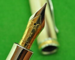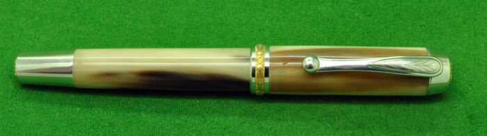 Beautiful Large Unbranded Fountain Pen in Faux Bamboo over Brass with Chrome and Gilded Trim. Probably made by Delta. Cartridge fill but complete with a converter. In Absolute Mint Condition. Fitted with the original Twin Tone 18kt gold medium tipped, semi flex nib. Heavy, high quality Pen
