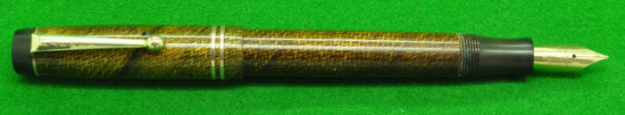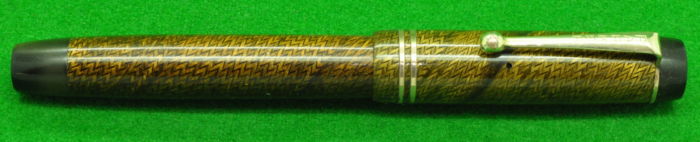 RARE Parker Duofold junior in Brown and black Herringbone with gold fill trim. In Near MINT Condition . Button Fill. Fitted with the original 14kt Gold Semi Flex medium tipped nib