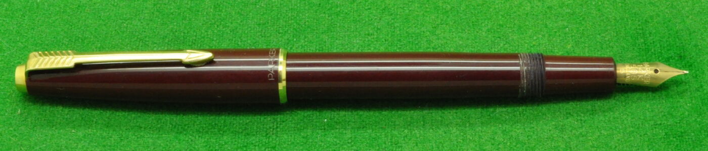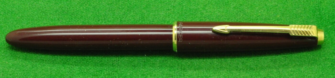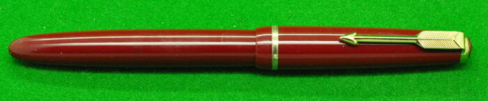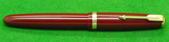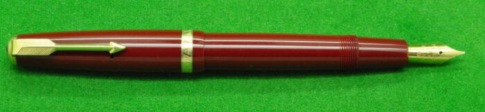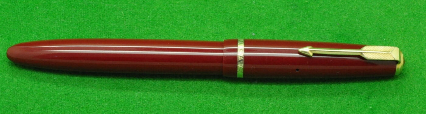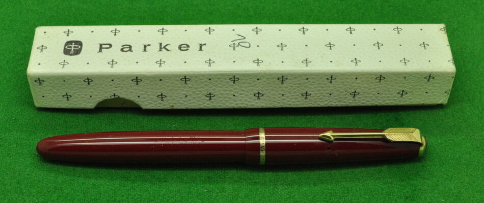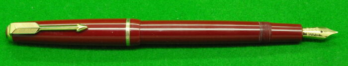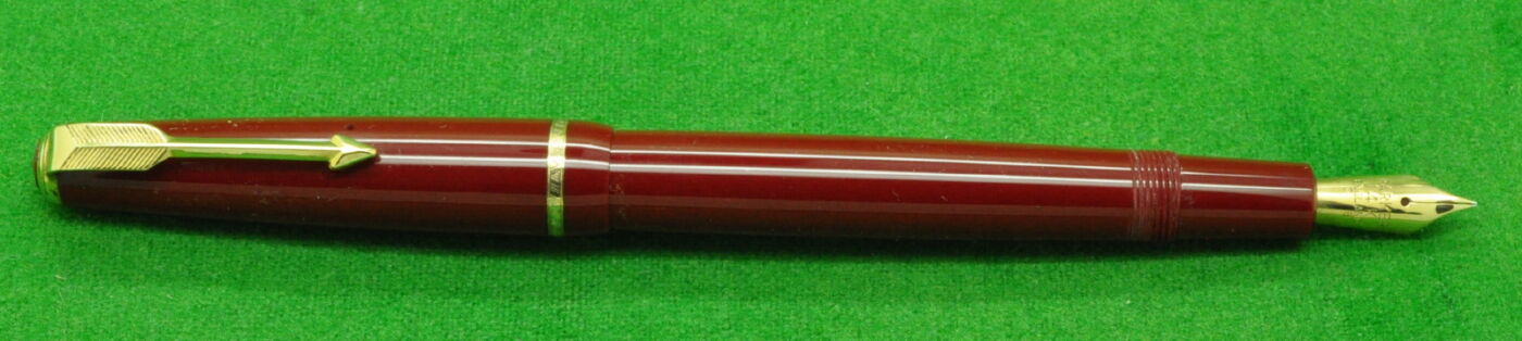 Late Parker Duofold Junior in Crimson and Gold Fill trim. Aerometric Fill. In Near MINT Condition. Fitted with the original 14kt gold medium tipped nib