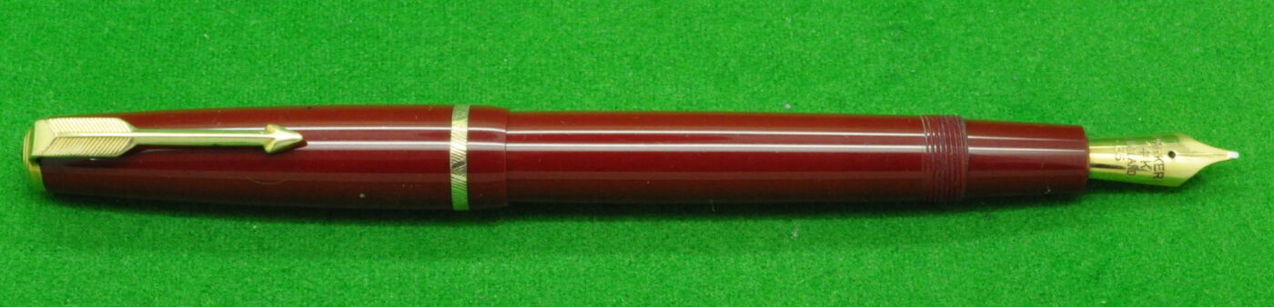 Scarce Late Parker Duofold in Crimson and Gold Fill trim. Aerometric Fill. In MINT Condition . Fitted with the original 14kt gold medium tipped nib