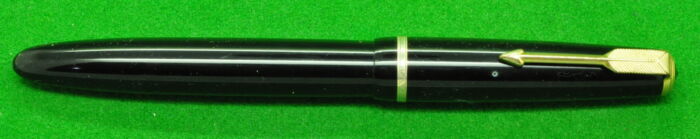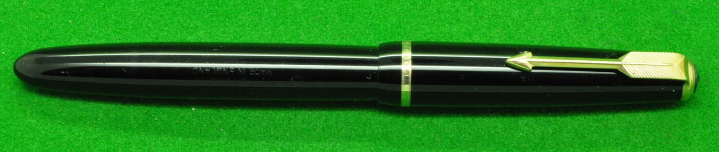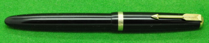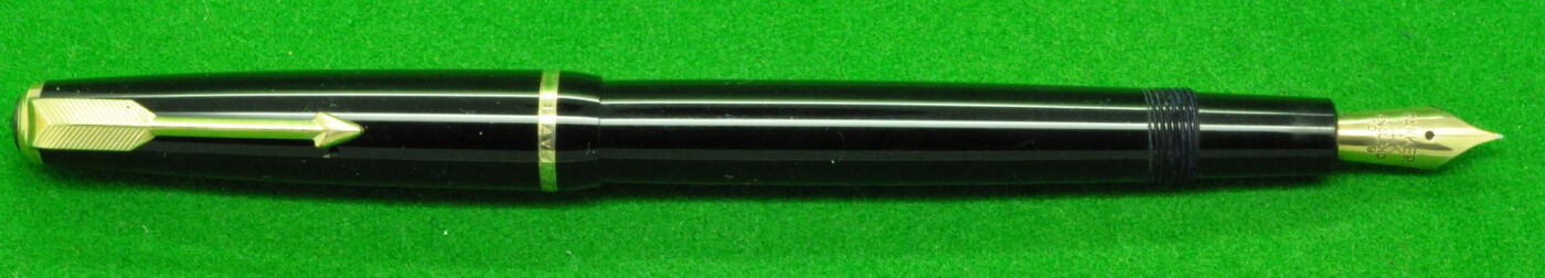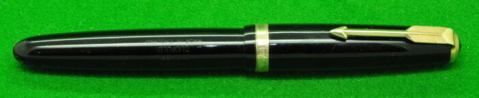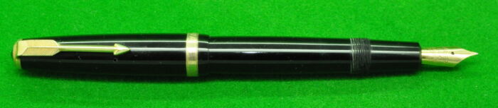 Late Parker Duofold Junior in Black and Gold Fill trim. Aerometric Fill. In Absolute MINT Condition. Fitted with the original 14kt medium to fine tipped nib