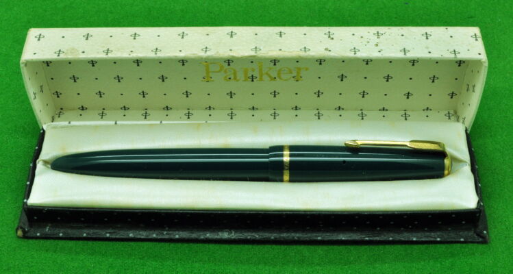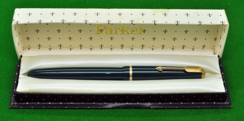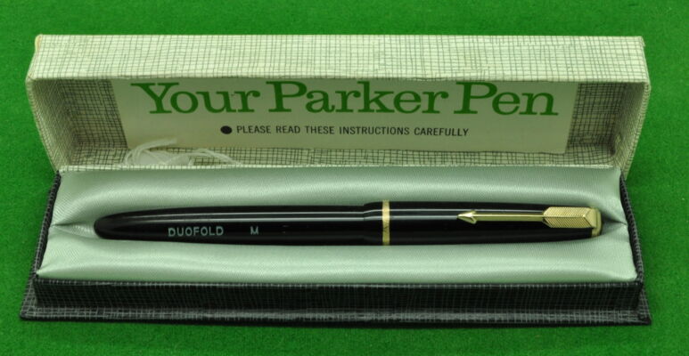Parker Duofold in Black with gold fill trim Aerometric fill. In Mint Unused Condition with Chalk Marks in original Box. Fitted with the original 14kt Gold Medium Tipped nib