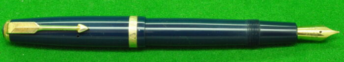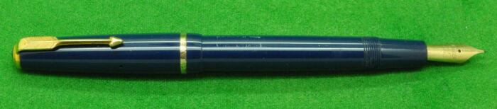 Parker Duofold Maxima in Blue with Gold fill trim. In Mint Condition. Aerometric fill. Fitted with the original 14kt Gold Medium to fine tipped nib .This is the Largest Size Duofold Measuring 142 mm long capped.