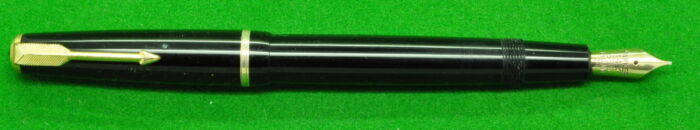 Parker Duofold Demi in Black with Gold fill trim. MINT. Aerometric fill. Fitted with the original 14kt Gold Medium Tipped nib.