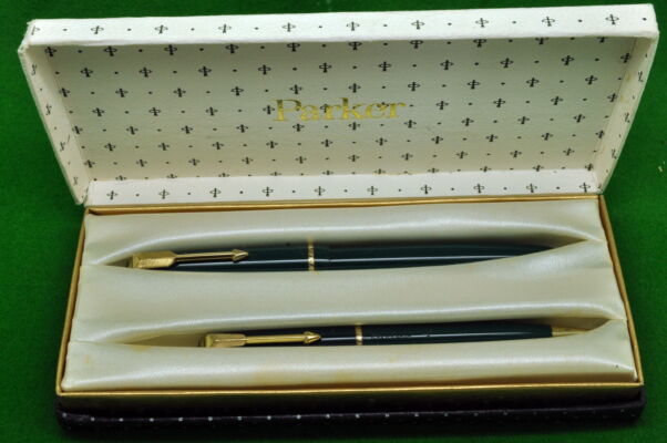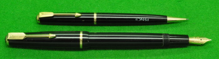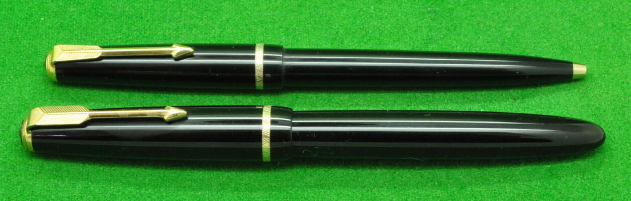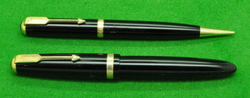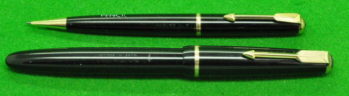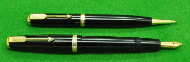 Late Parker Duofold Junior SET in Black and Gold Fill trim. Fountain Pen and Pencil. Both in Absolute MINT Condition. Fountain Pen Aerometric Fill, fitted with the original 14kt medium tipped nib