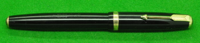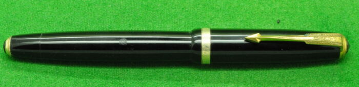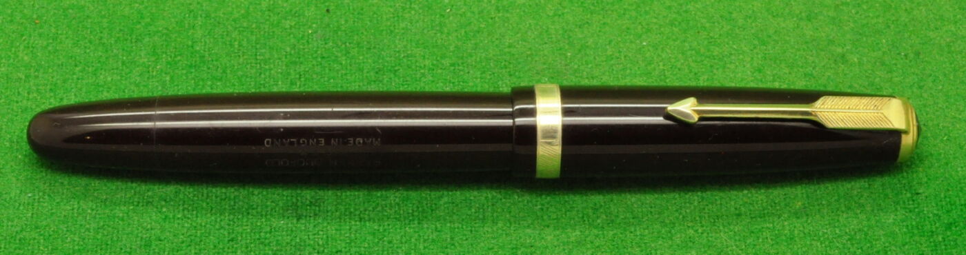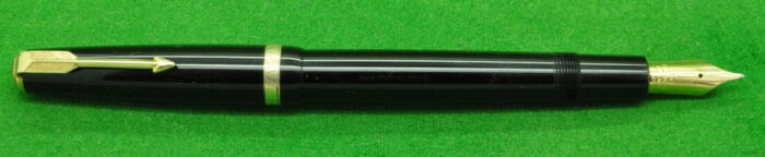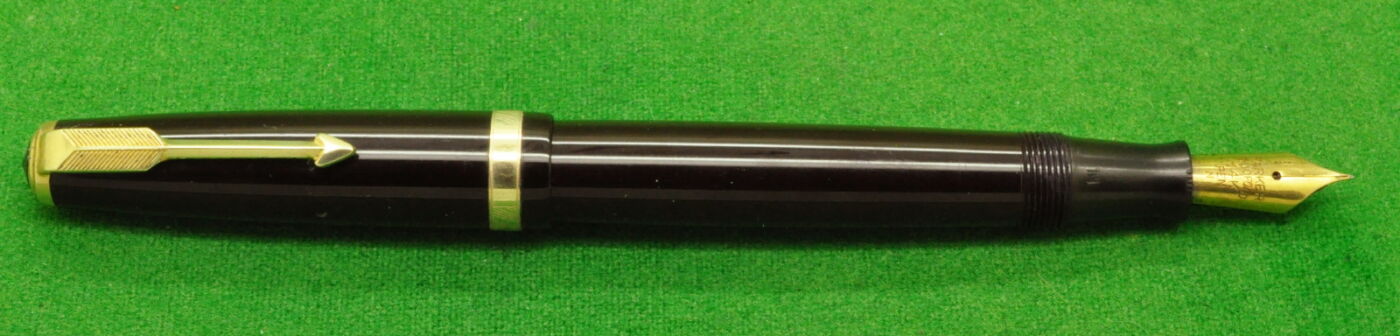 Large Parker Duofold Senior in Black with gold fill trim Aerometric fill. Measures 141 mm Long capped. In MINT condition. Fitted with the original 14kt Gold Medium Tipped nib