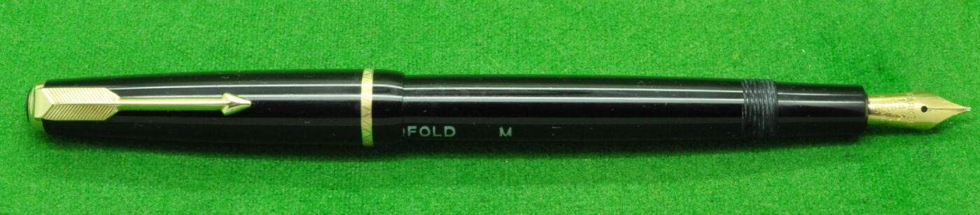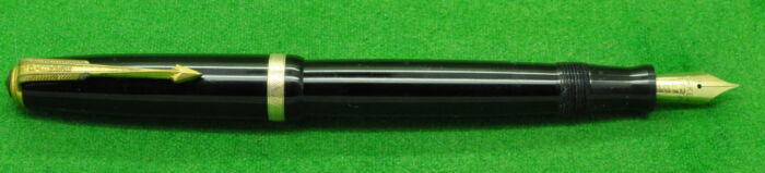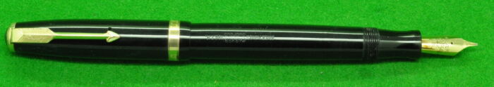 Parker Duofold Maxima in Black with Gold fill trim. In Mint Condition. Aerometric fill. Fitted with the original 14kt Gold medium tipped Nib This is the Largest Size Duofold Measuring 142 mm long capped.