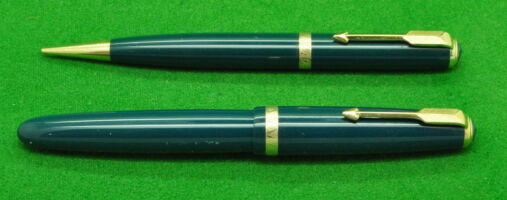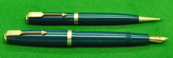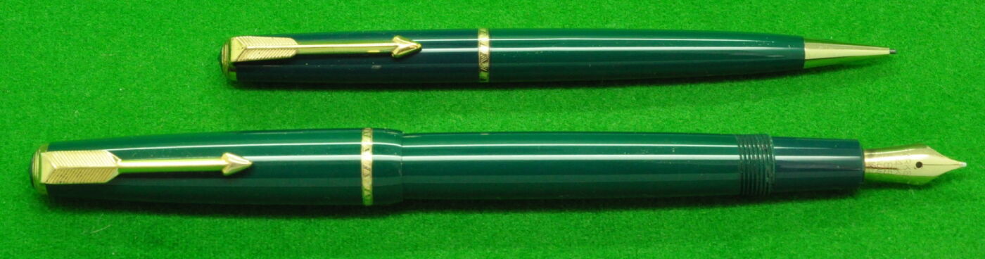 Parker Duofold Demi SET in Green with Gold fill trim. Fountain Pen and Pencil. Both In MINT condition. Fountain Pen, Aerometric fill, Fitted with the original 14kt Gold Medium Tipped nib.