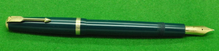 Parker Duofold Maxima in Green with Gold fill trim. In Mint Condition. Aerometric fill. Fitted with the original 14kt Gold Medium  tipped nib .This is the Largest Size Duofold Measuring 142 mm long capped.