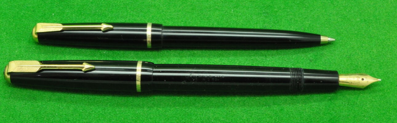 Parker Duofold Junior SET in Black and Gold Fill trim. Fountain Pen and Scarce Ballpoint. Both in Absolute MINT Condition. Fountain Pen Aerometric Fill, fitted with the original 14kt medium tipped nib