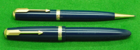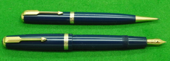 Parker Duofold Demi SET in Blue with Gold fill trim. Fountain Pen and Pencil. Both In MINT condition. Fountain Pen, Aerometric fill, Fitted with the original 14kt Gold Medium Tipped nib.
