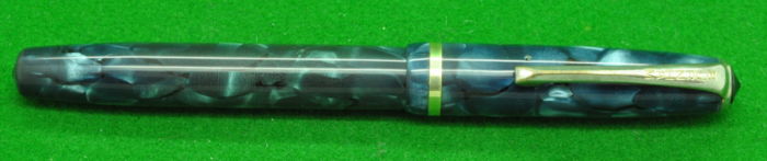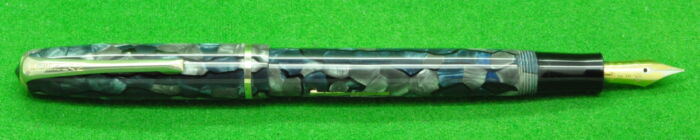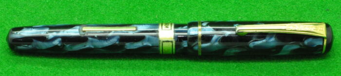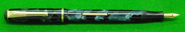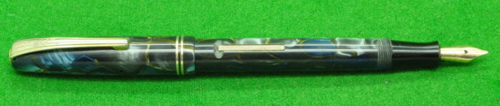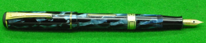 Beautiful Burnham 48 in Black Lined Pearl Blue and Grey Marble with gold fill trim. In MINT condition. Fitted with the original super smooth medium tipped nib.