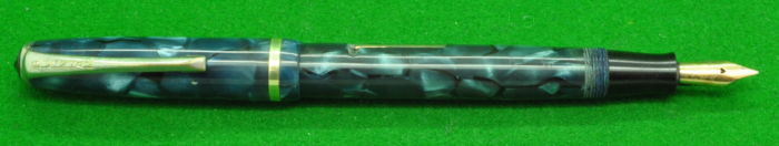 Burnham 49 in Gold Lined Blue and Black Marble with gold fill trim. In MINT condition . Fitted with the original 14kt gold, Super Smooth medium tipped nib.
