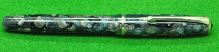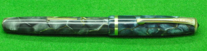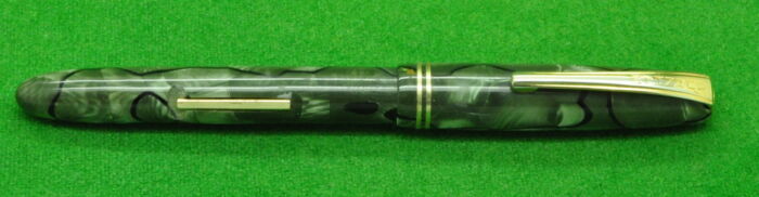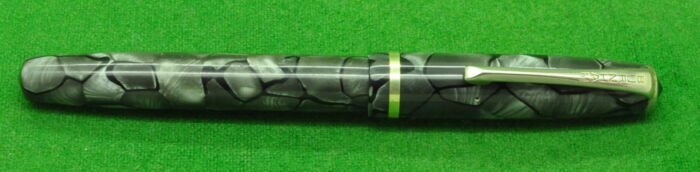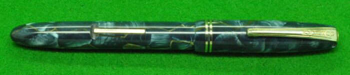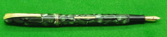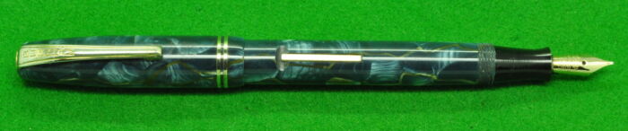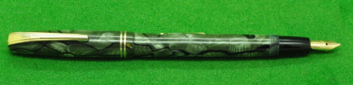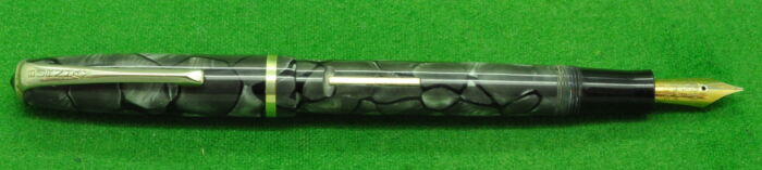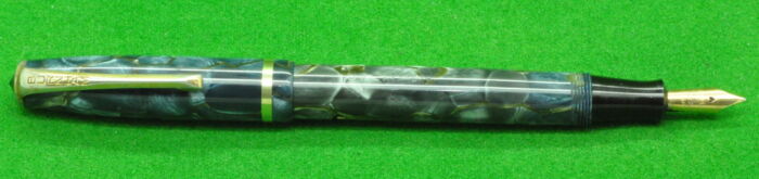 Beautiful Burnham 54 in Black Lined Pearl Green Marble with gold fill trim. In MINT condition. Fitted with the original super smooth 14kt gold Broad tipped nib.