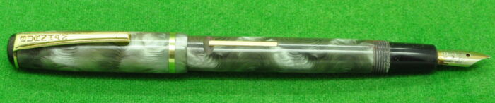 Beautiful Burnham 48 in Black Lined Pearl Grey Marble with gold fill trim. In Mint Condition but with some plate loss to clip. Fitted with the original super smooth medium tipped nib.