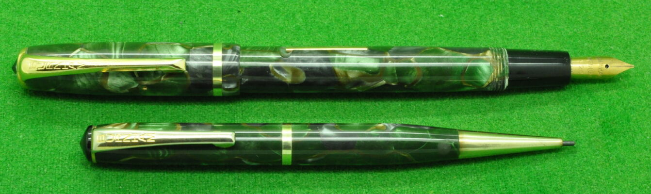 Beautiful Burnham 48 SET in Gold Lined Pearl Green and Grey Marble with gold fill trim. Fountain Pen and Pencil, Both in Absolute Mint Unused condition in original Box. Fountain Pen Fitted with the original medium tipped nib.