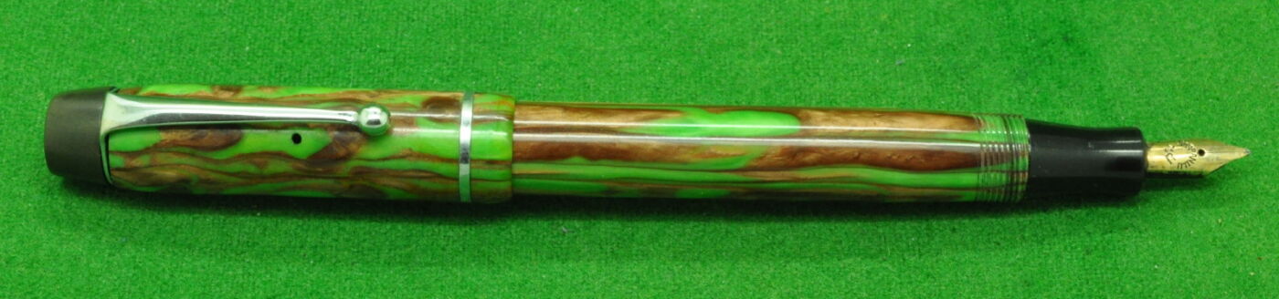 Mentmore Golden Platignum in Lime Green and Bronze with Nickel Silver trim. In Near MINT Condition in original Box. Fitted with the original super smooth, semi flex, 14kt gold Medium tipped nib