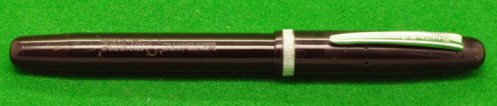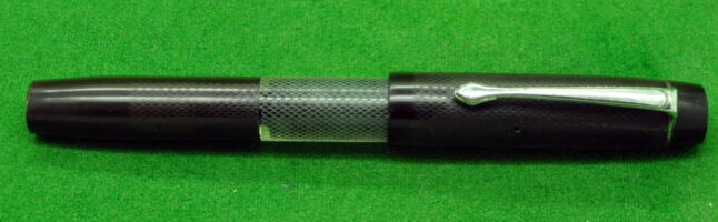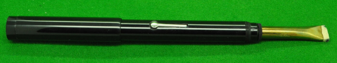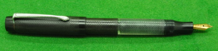 Mentmore Platignum Visi-Ink in Chased Black Hard Rubber with Nickel Silver trim. In Near MINT Condition. Fitted with the original 14kt gold , Semi flex medium tipped nib.
