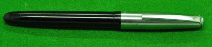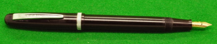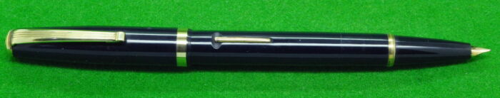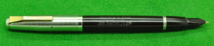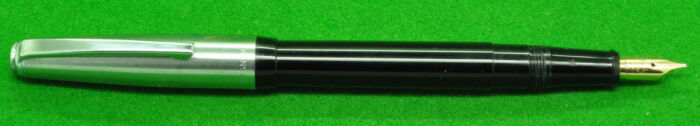 Mentmore Platignum “Gold Nib” in Black and Stainless. In Near Mint Condition. Pressmatic Fill. Fitted with the original 14kt gold , super smooth, medium tipped nib.