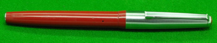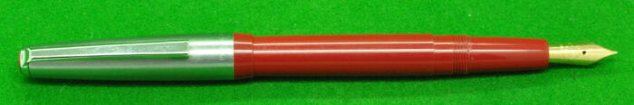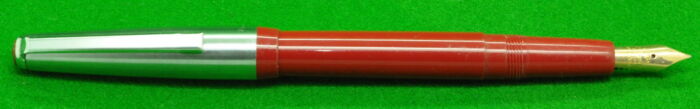 Mentmore Platignum “Gold Nib” in Crimson and Stainless. Pressmatic fill. In Nr Mint Condition but with one small area of wear on the cap. Fitted with the original 14kt gold , super smooth, medium tipped nib.