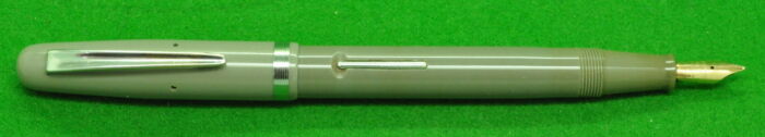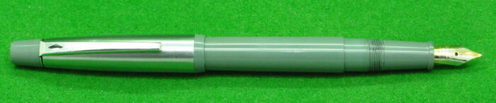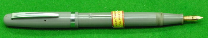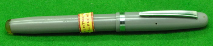 Late Mentmore Supreme in Grey With Nickel Silver trim. In Near MINT Condition. Lever fill. Fitted with the original super smooth 14kt gold, semi flex, medium tipped nib