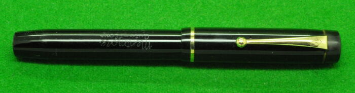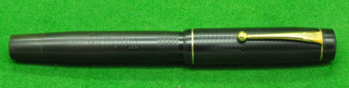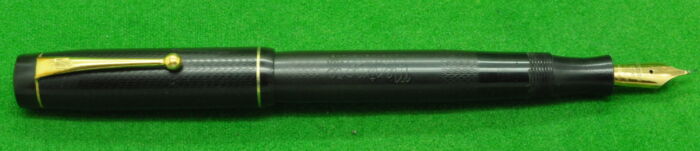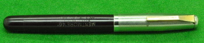 Mentmore Autoflow in Chased Black with gold filled trim. Button fill. This pen is in remarkable MINT condition. Fitted with the original 14kt gold medium tipped nib.