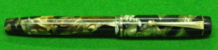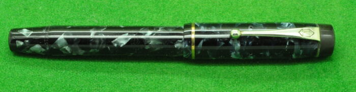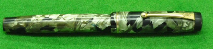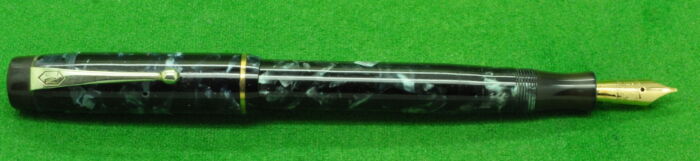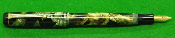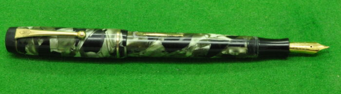 Mentmore Autoflow in Pearl and Black Marble with gold filled trim. Lever Fill. In Mint Condition. Fitted with the original 14kt gold, semi flex, medium tipped nib.