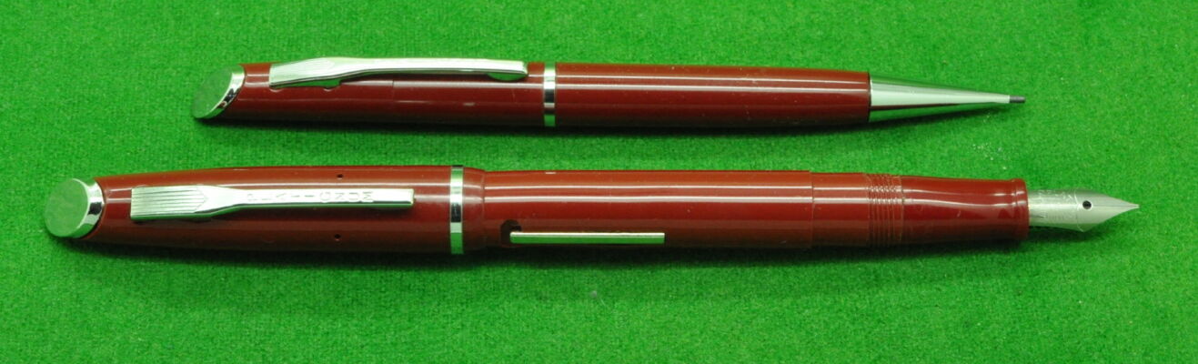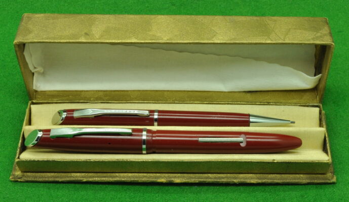 Mentmore Platignum SET in Red with Chrome Trim. Fountain Pen and Pencil. Both MINT Unused in original Box. Fountain Pen fitted with the original super smooth, medium tipped nib.