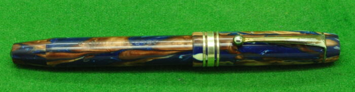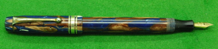 Stunning Golden Guinea (Most Likely Made by Mentmore) in Royal Blue and Bronze with Cream Flecks. Gold filled trim. In Absolute Mint Condition. Button fill. Fitted with the original 14kt gold, Semi flex medium tipped nib.