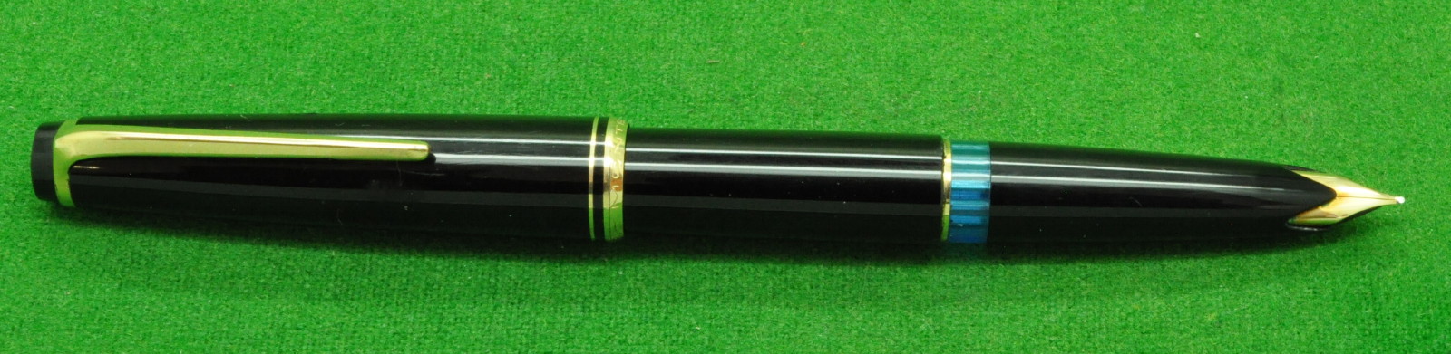 Montblanc 31 in Black with Gold filled trim. In Mint Condition . Piston fill. Fitted with the original, Scarce 14kt gold, Semi Flex Left Oblique Italic Nib giving a wonderful writing style.