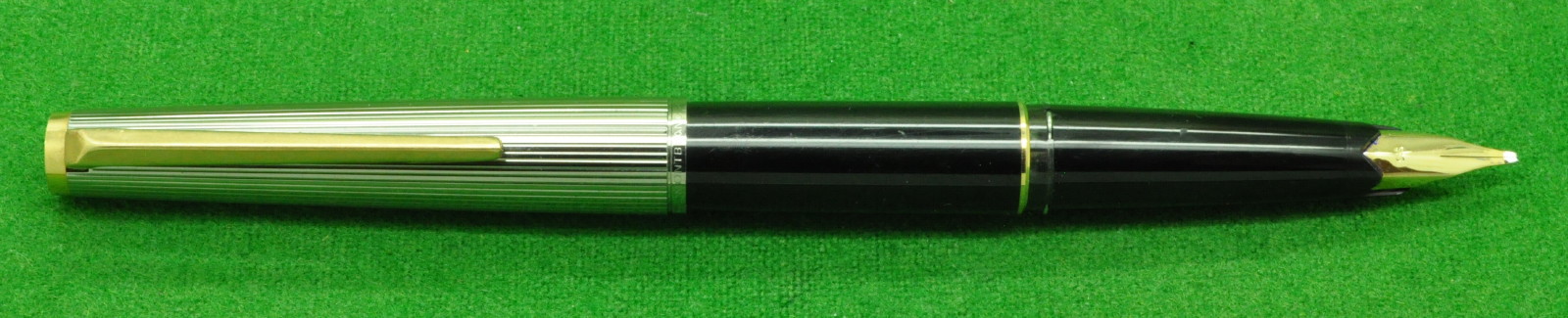 Montblanc Noblesse 1128 in Stainless with gold filled trim. In Mint Condition. Cartridge Fill but complete with original Converter. Fitted With the Original 14kt gold Super Smooth, semi flex Broad Stub italic nib giving a wonderful writing style.