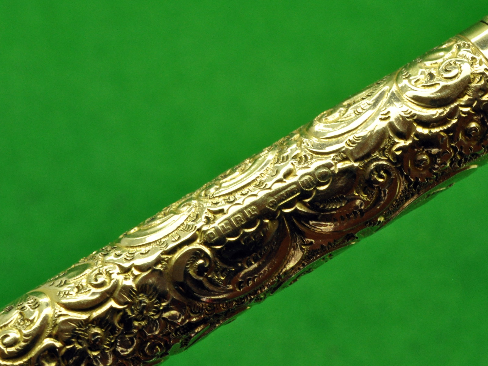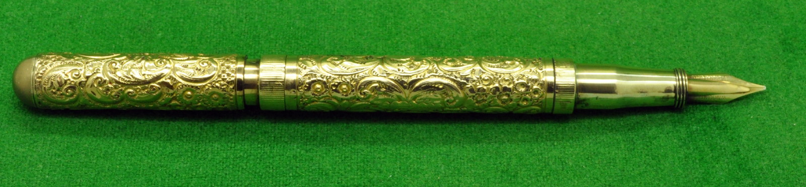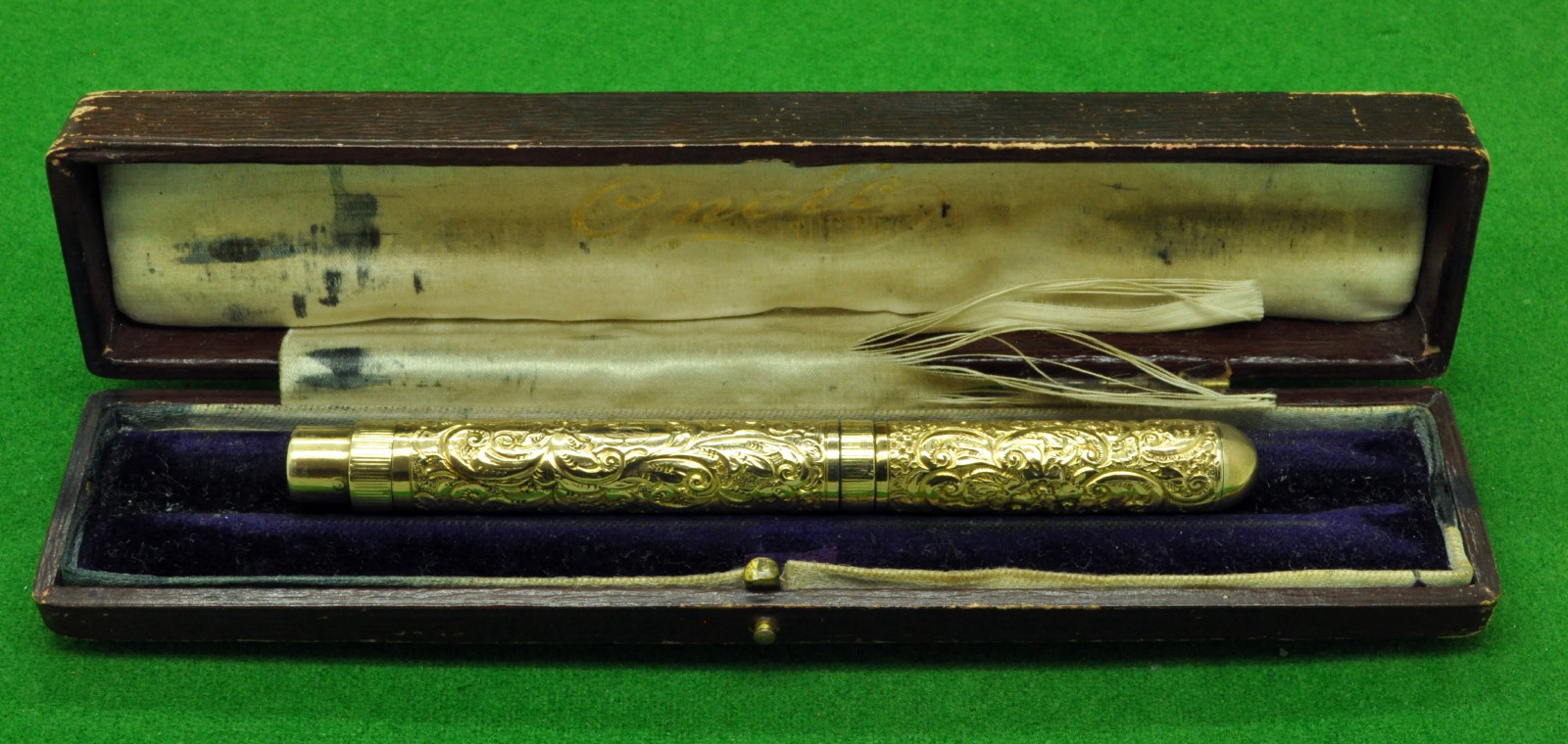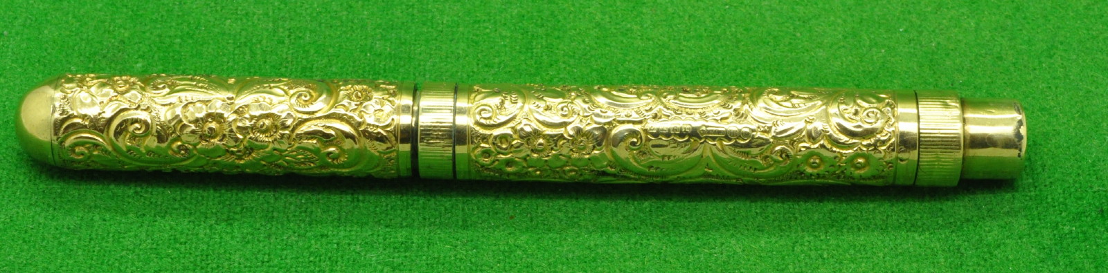 Rare Early Onoto O Type Piston fill with Solid 9kt gold hand engraved scroll pattern overlay. Fully hallmarked and dated 1907. In Perfect Condition in original box. Fitted with the original 14kt gold extremely flexible, wet Noodle Medium tipped nib with gold split feed giving a wonderful writing style. Beautiful, Highly sought after pen with superb nib
