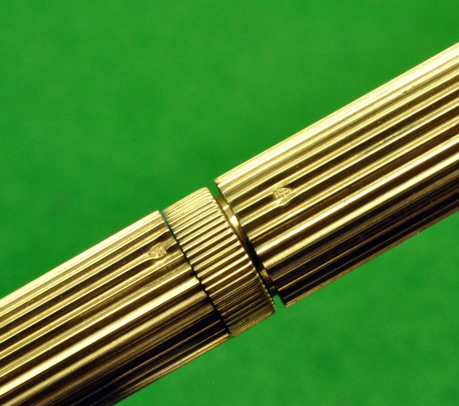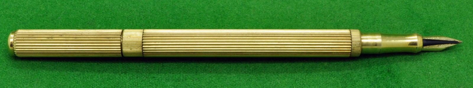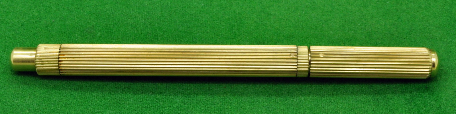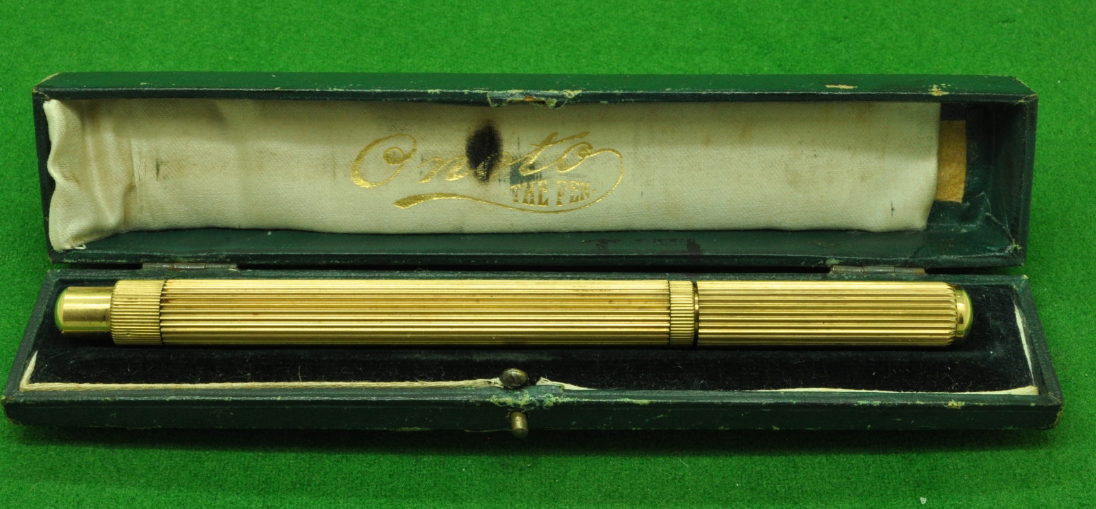 Rare Early Onoto N Type With Solid 18kt Gold Overlay in Ribbed Pattern. In Perfect Condition in original Box . French Hallmarks. Piston fill . Fitted with the original 14kt gold full flex, wet Noodle Medium tipped nib with split feed giving a wonderful writing style. Beautiful, Highly sought after pen with superb nib