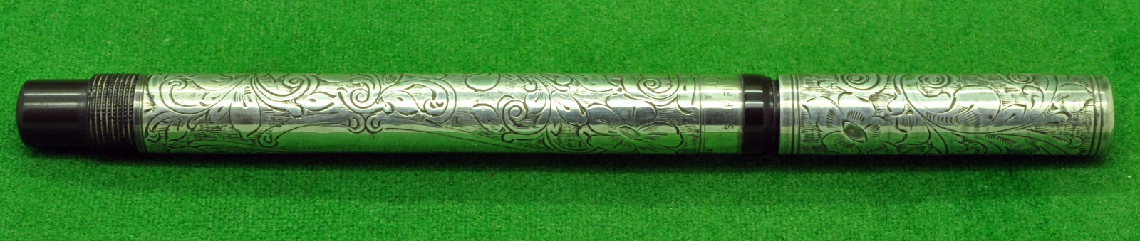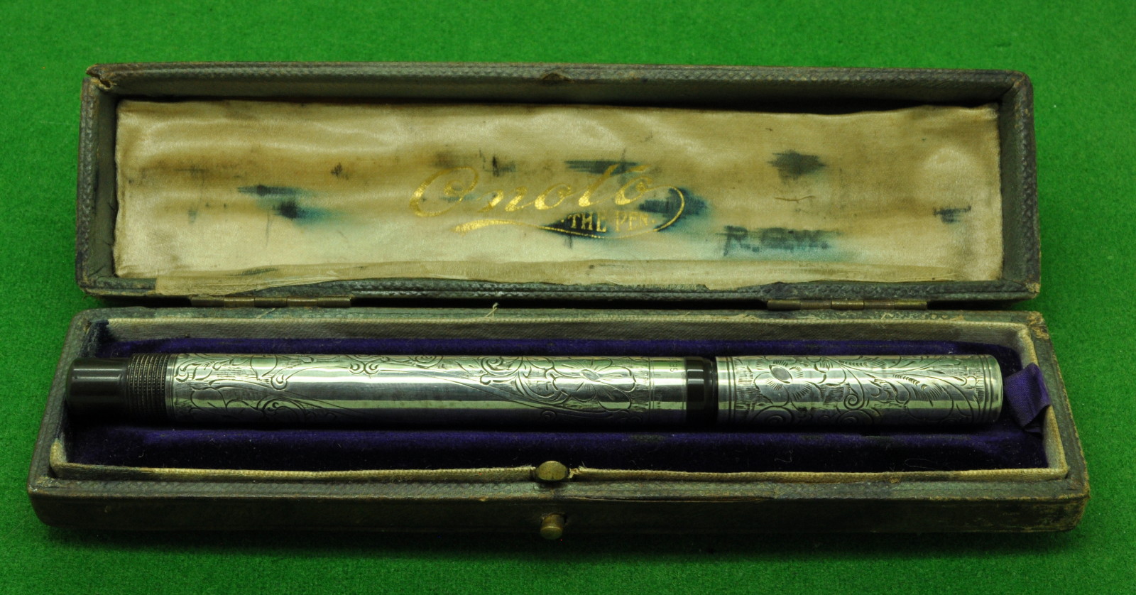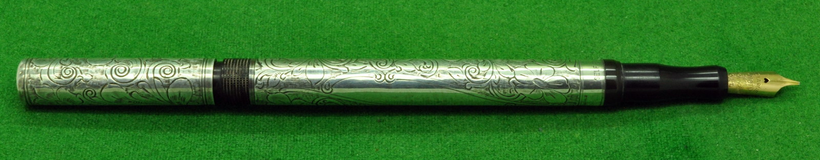 Rare Early Onoto N Type With Solid sterling Silver Overlay with hand decorated Floral Pattern. In Perfect Condition in original Box . Piston fill . Fitted with the original 14kt scarce, semi flex left Oblique Italic Nib giving a wonderful writing style. Beautiful, Highly sought after pen with superb nib