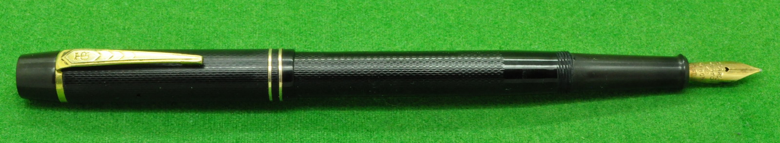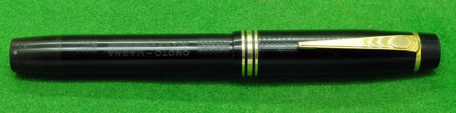 Magnificent Early Onoto Magna 1873 in Chased Black with Gold Filled Trim. In Mint Condition. Piston fill. Fitted with the original Twin tone, 14kt gold huge number 7, semi flex medium tipped nib.