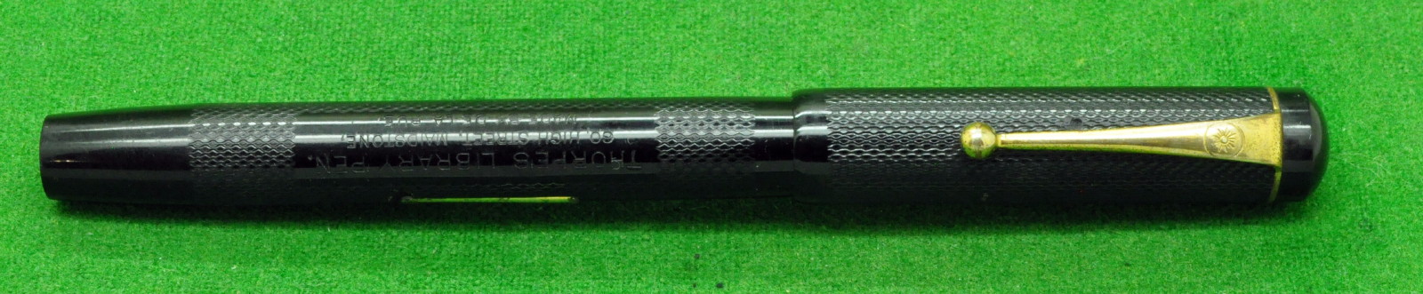 Large Onoto in Chased Black Hard Rubber with gold filled trim. Branded Thorpes Library Pen. In Remarkable MINT Unused condition. Lever fill. Fitted with the original 14kt gold, Semi flex, medium tipped nib. Rare to find in this condition. Measures 137 mm long capped.