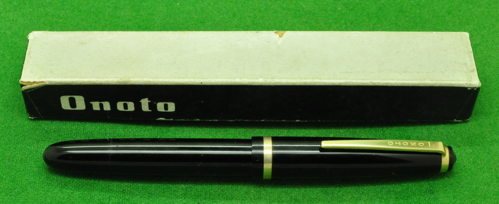 Onoto K2 in Black with gold filled trim. In Absolute MINT Condition in original Box. Piston Fill. Fitted with the original 14kt gold medium tipped nib.