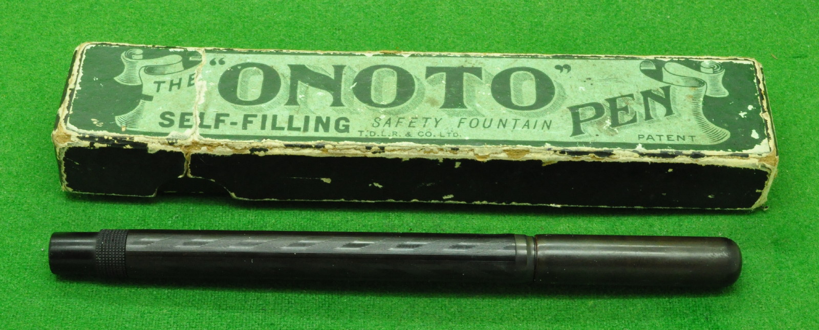 Early Onoto N Type in Black Hard Rubber Chevron Pattern. In Perfect Condition in Original (Tatty) Box with Instructions. Piston fill . Fitted with the original 14kt over and Under fed Full Flex, Wet Noodle Nib giving a wonderful writing style.