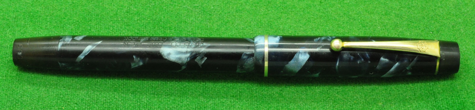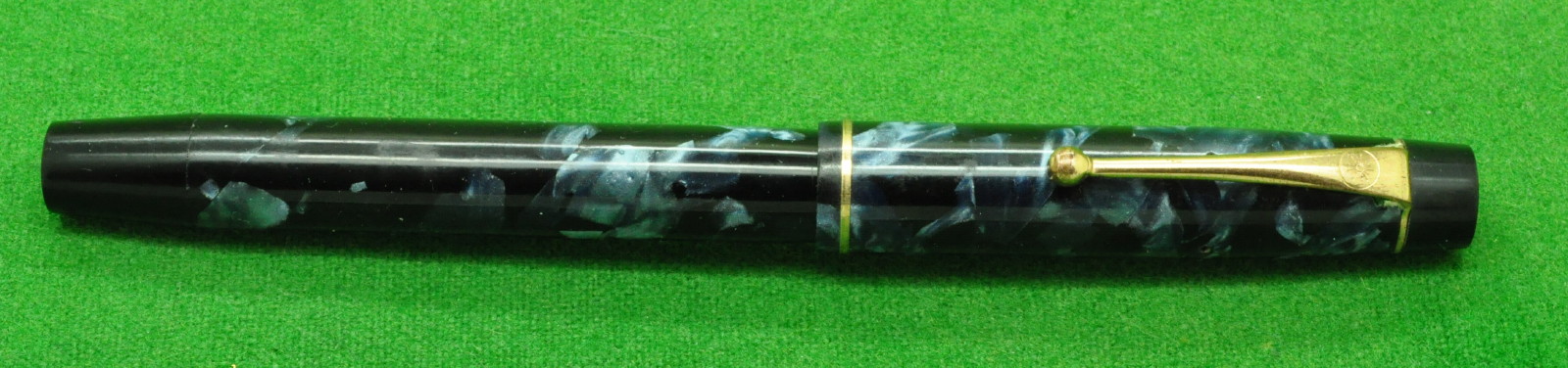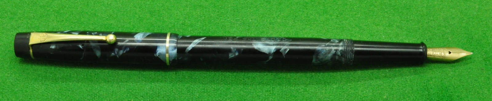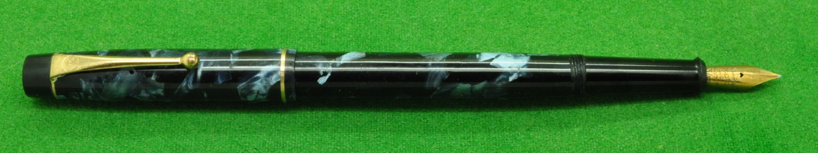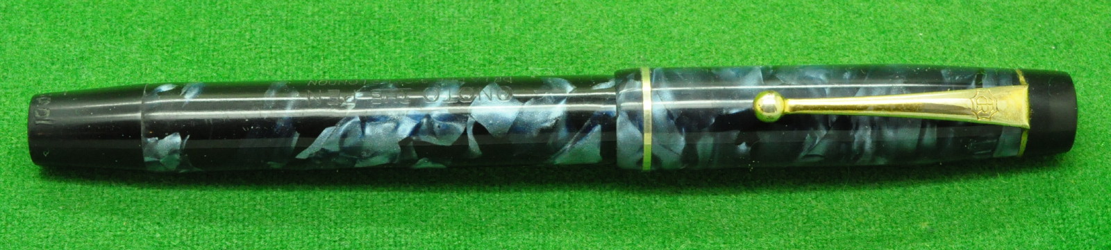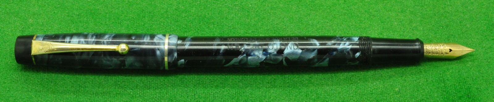 Onoto 5601 80 in Black and Blue Marble with Gold filled trim. In Near Mint Condition. Piston fill. Fitted with the original 14kt gold, semi flex , super smooth medium tipped nib.