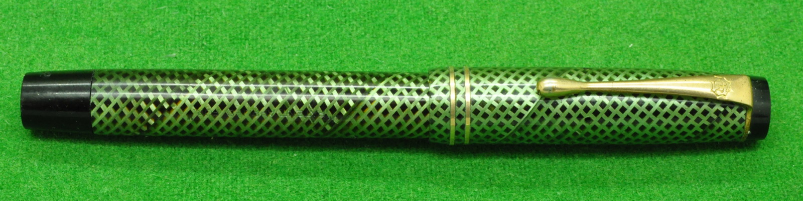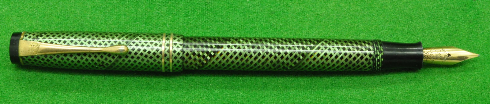 Beautiful Unnumbered Onoto Piston fill in Pearl Green & Black Marble. In remarkable MINT Condition. Fitted with the original 14kt gold, semi flex , super smooth medium tipped nib.