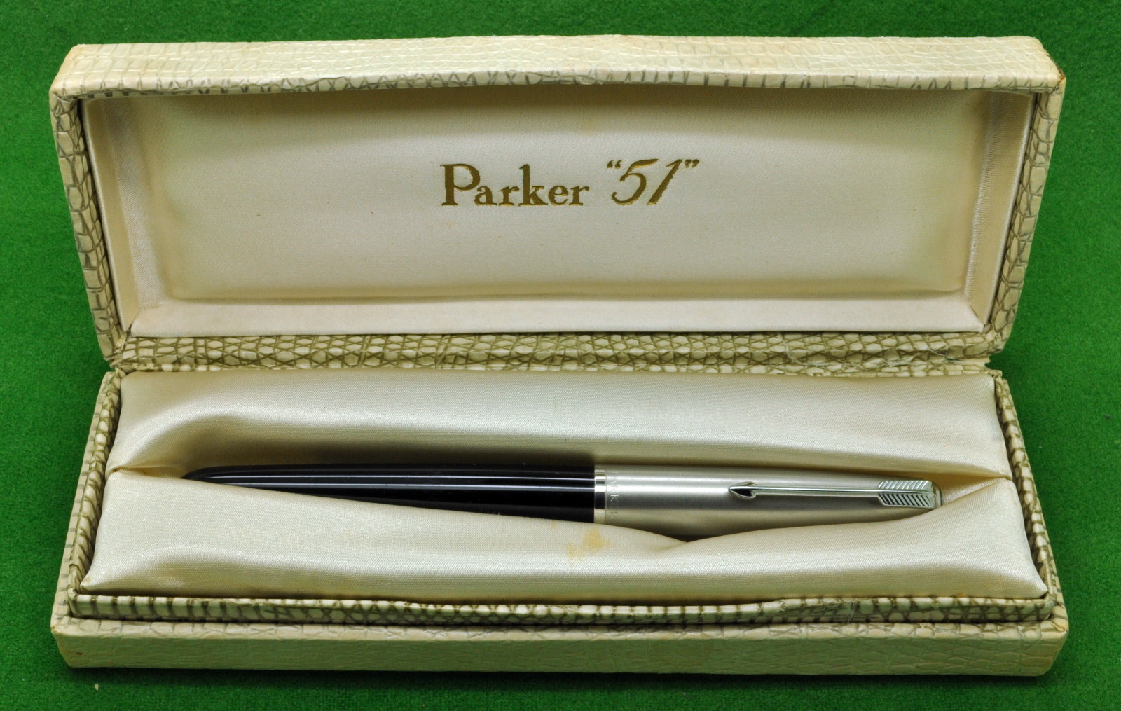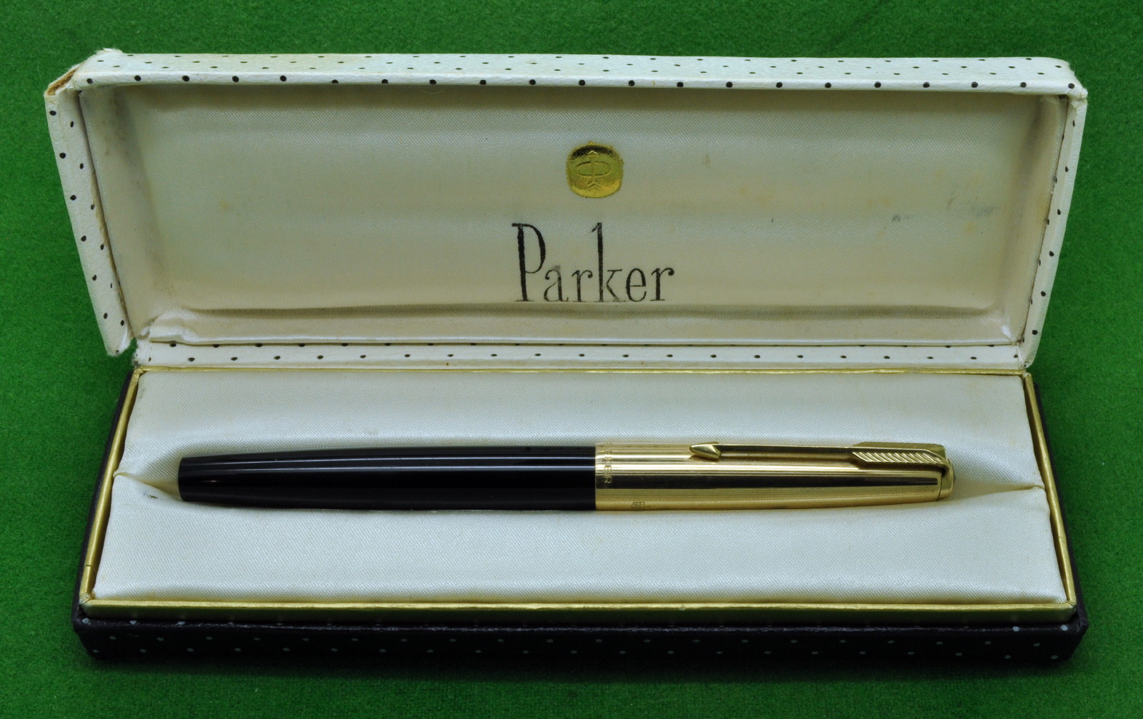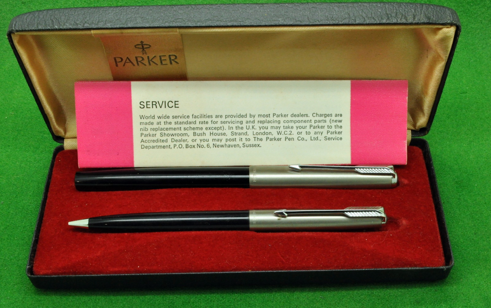 Parker 51 Custom SET In Black with Gold filled caps. Fountain Pen and Clutch Pencil. Both in Near Mint Condition in original Near MINT Box. Fountain Pen – Aerometric fill, fitted with the original , super smooth, medium tipped Nib .